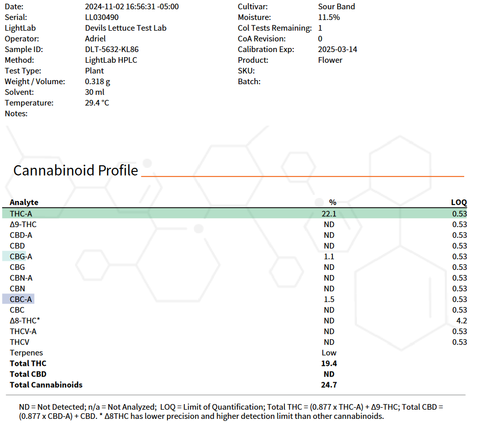 Link to the test by Devil’s Lettuce Test Labs COA using Orange Photronics: